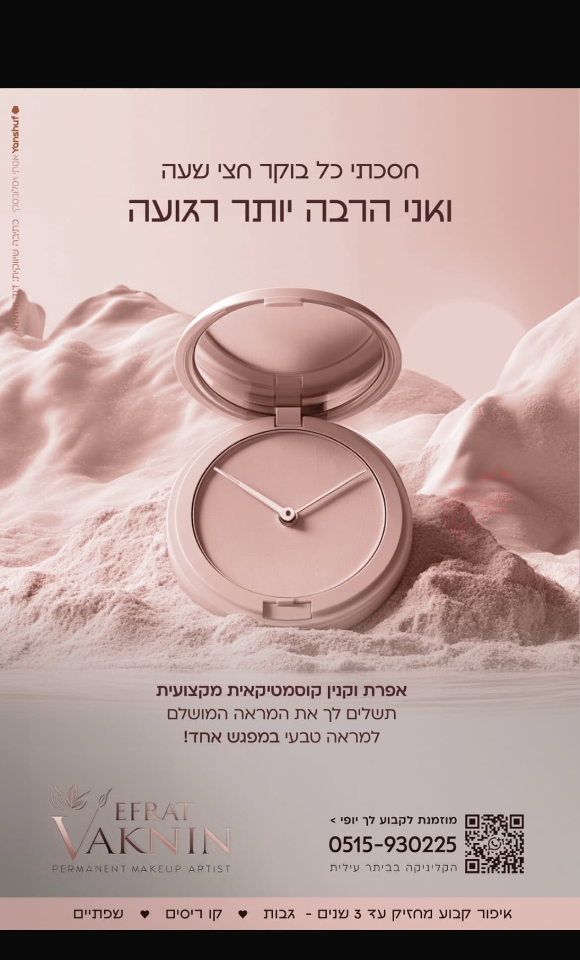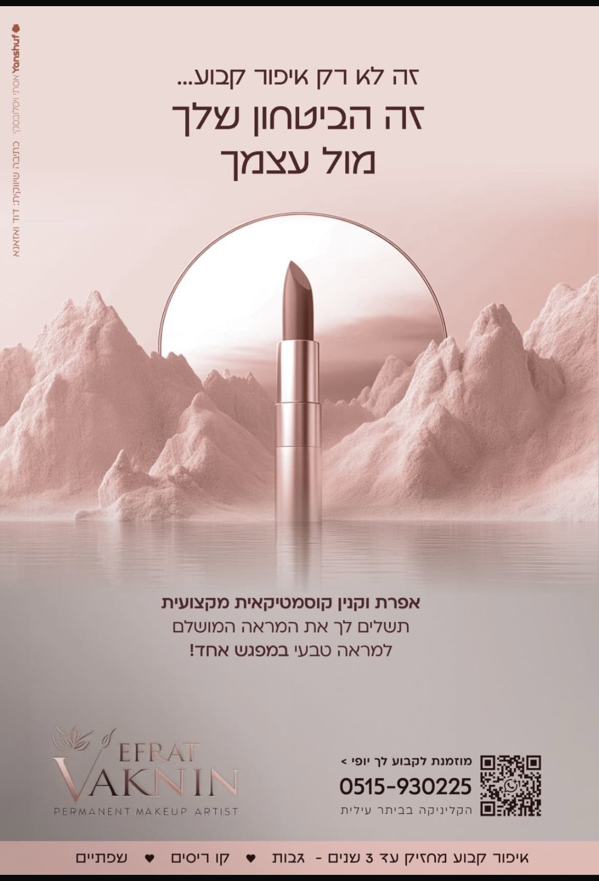 אפרת וקנין מומחית לאיפור קבוע בשיטת פודרה מודרנית ושיטת השערה אם זה גבות שפתים קו ריסים אפרת מוציאה כל לקוחה מרוצה נקודה.